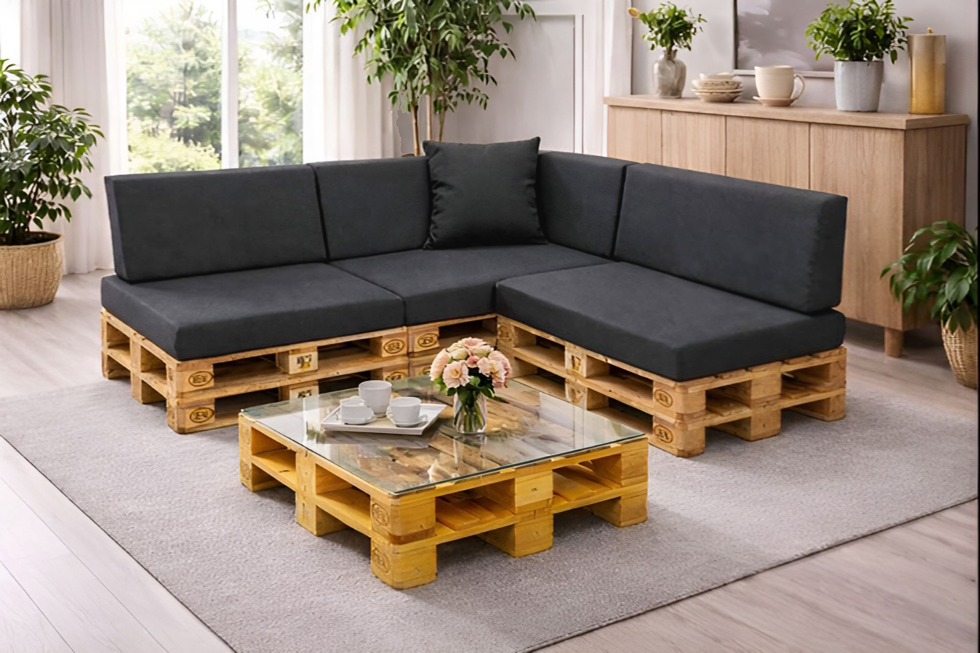 Mit nur einem Set bauen Sie im Handumdrehen ein bequemes Sofa oder Ecksofa aus Europaletten – ganz ohne Aufpreis.