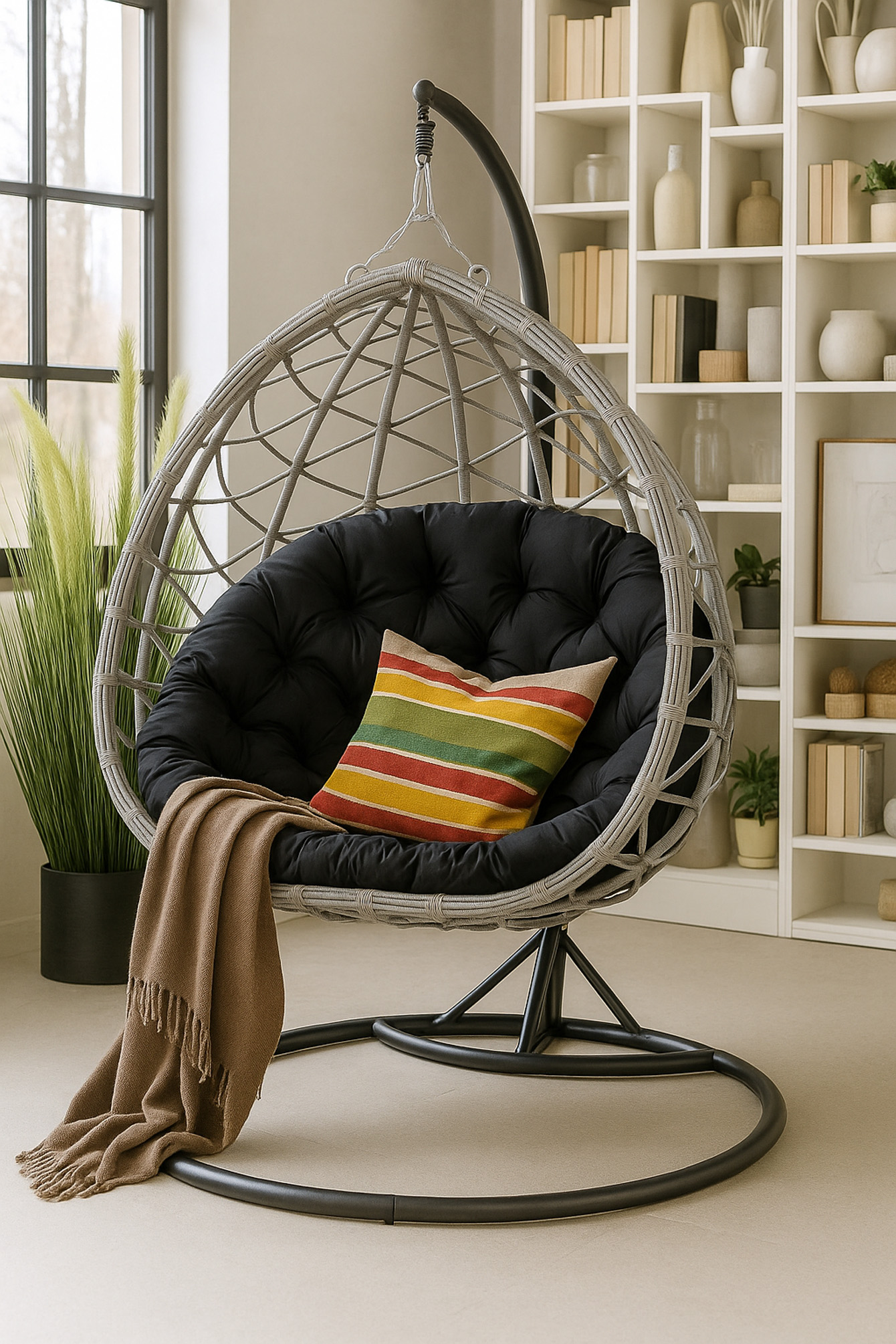Nous proposons des coussins matelassés pour un fauteuil suspendu de jardin.