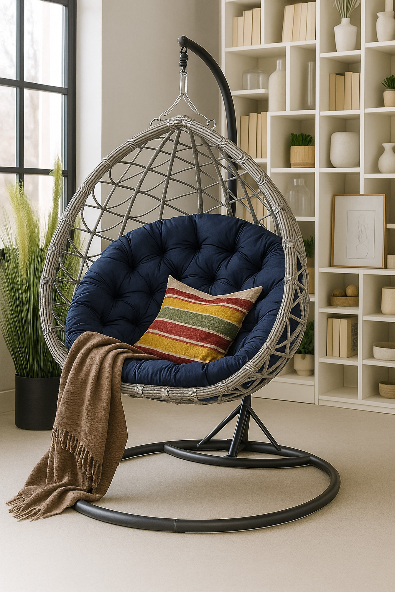 Nous proposons des coussins matelassés pour un fauteuil suspendu de jardin.