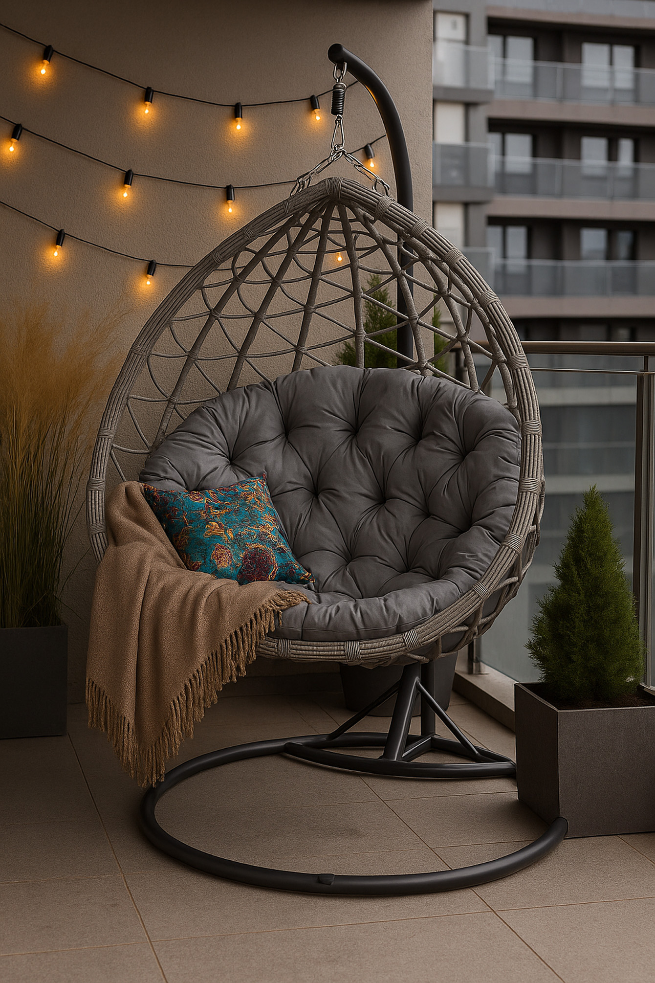 Offriamo cuscini trapuntati per una poltrona sospesa da giardino.