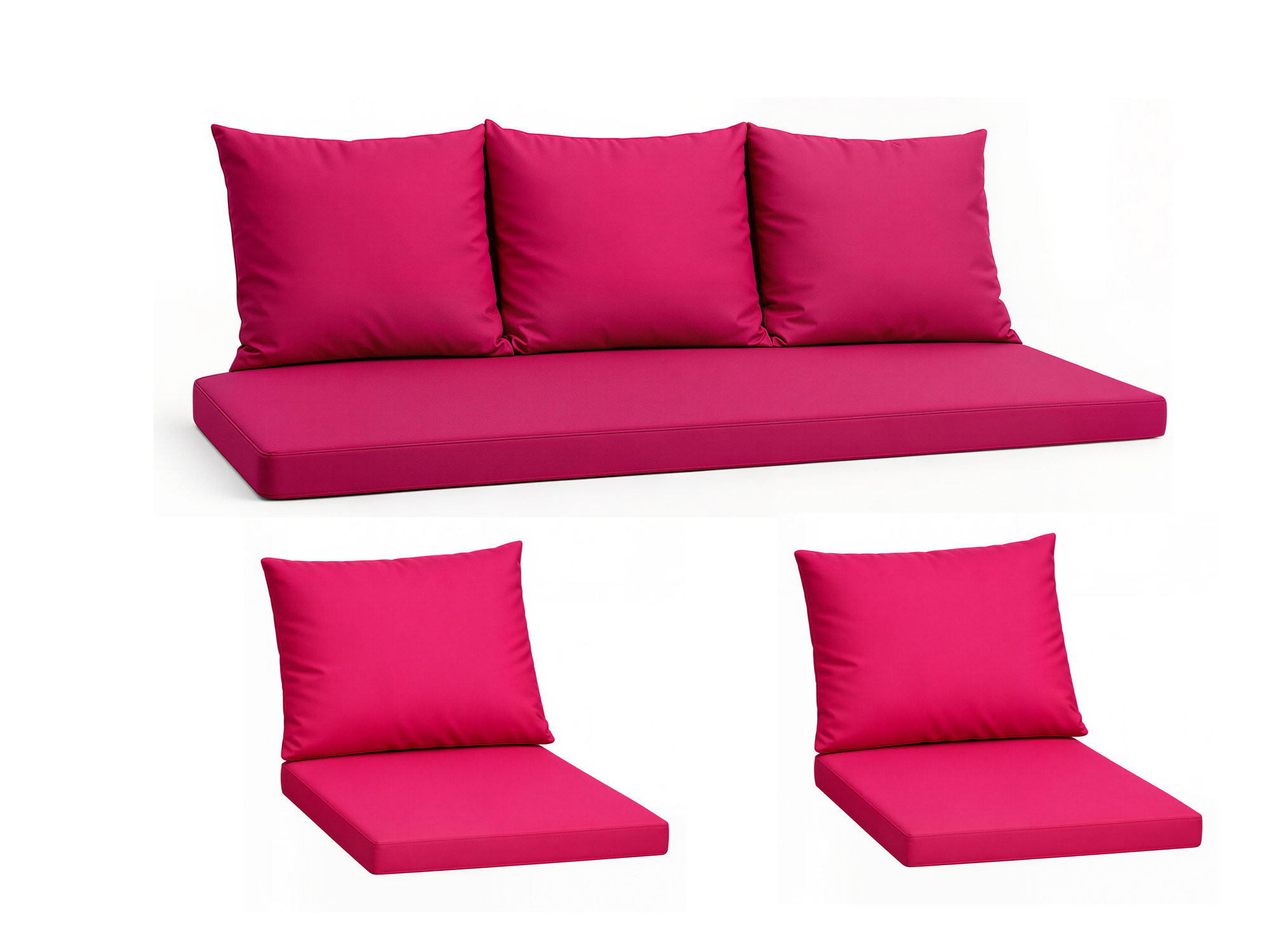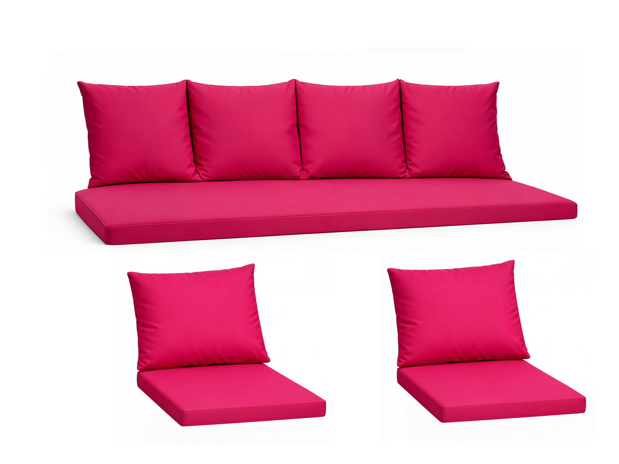 Zestaw dostępny jest w wariancie dla 4 lub 5 osób, z możliwością wyboru długości i szerokości poduszek kanapowych, co pozwala idealnie dopasować komplet do posiadanych mebli rattanowych.